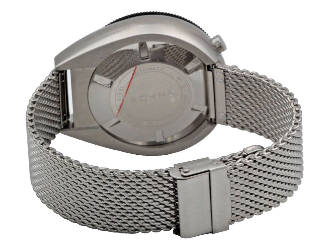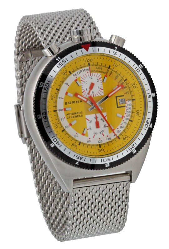 Schwere XL Automatikuhr im Retro-Style von SORNA. Drehlünette, Tachymeter, Wochentag- und Datumanzeige sind die Ausstattungsmerkmale dieser markanten Herrenuhr.